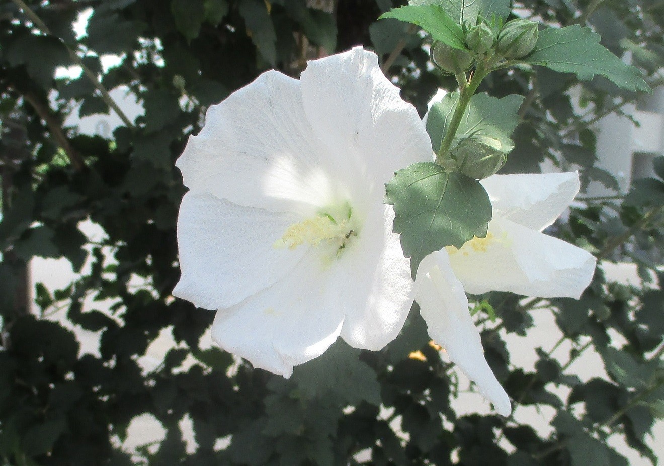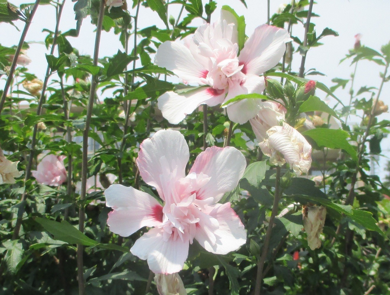 ●むくげ(木槿)1~4:我が団地の隣のマンションの周囲で、8月7日11時50分頃に撮影しました。原産地は中国、日本へは平安時代に渡来。早朝の3時頃に開花した花は夕方には萎んでしまう「一日花」。韓国の国花であり、花色は(桃、藤、白、紫)と多く、八重咲品種も多くある。よく見かける白地で花の底が赤い(むくげ1)のような花の品種は「日の丸」と呼ばれるが、茶人の(千宗旦)がこの花を茶花として非常に愛したことから「宗旦むくげ」とも呼ばれている。