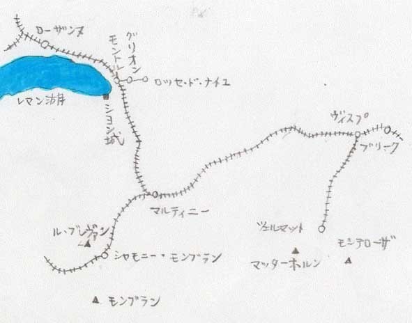 1998年7月22日朝、ツェルマット駅を氷河特急で8時18分に出発し、北に進みヴィスプ駅(Visp)を経由して西に進み、マルティ二―駅(Martigny)に10時37分に到着した。