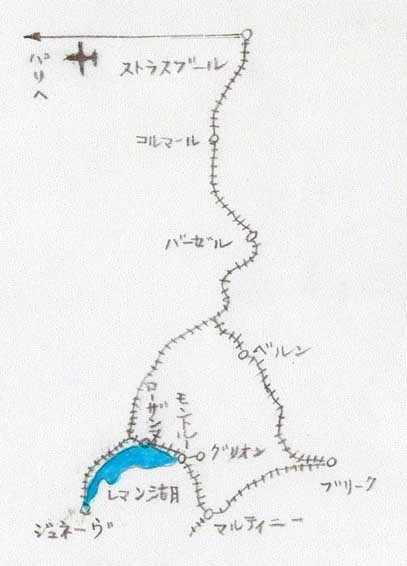 1998年7月25日朝、登山電車でグリオン駅を出発し、モントルー駅(Montreux)に7時55分に到着した。ここで急行列車に乗り換え、モントルー駅を8時10分に出発して西に進みジュネーヴ駅(Geneve)に9時20分に到着した。