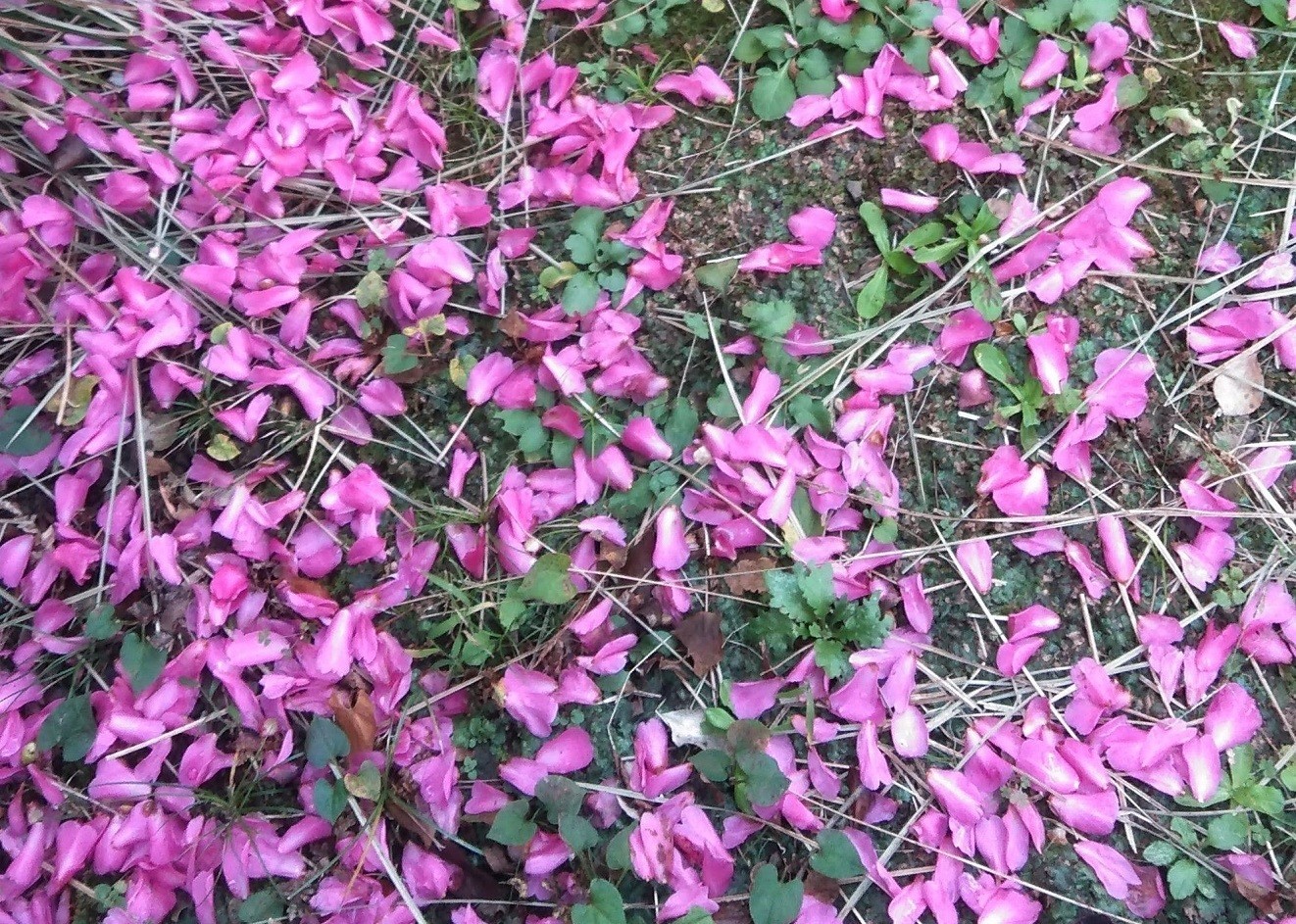 ●山茶花 ●落ちた山茶花の花弁:我が団地内で、11月3日に撮影しました。以前に椿は花丸ごと落下し、山茶花は花弁1枚1枚が落下すると書きましたが、まさにその様子を写真に収めました。