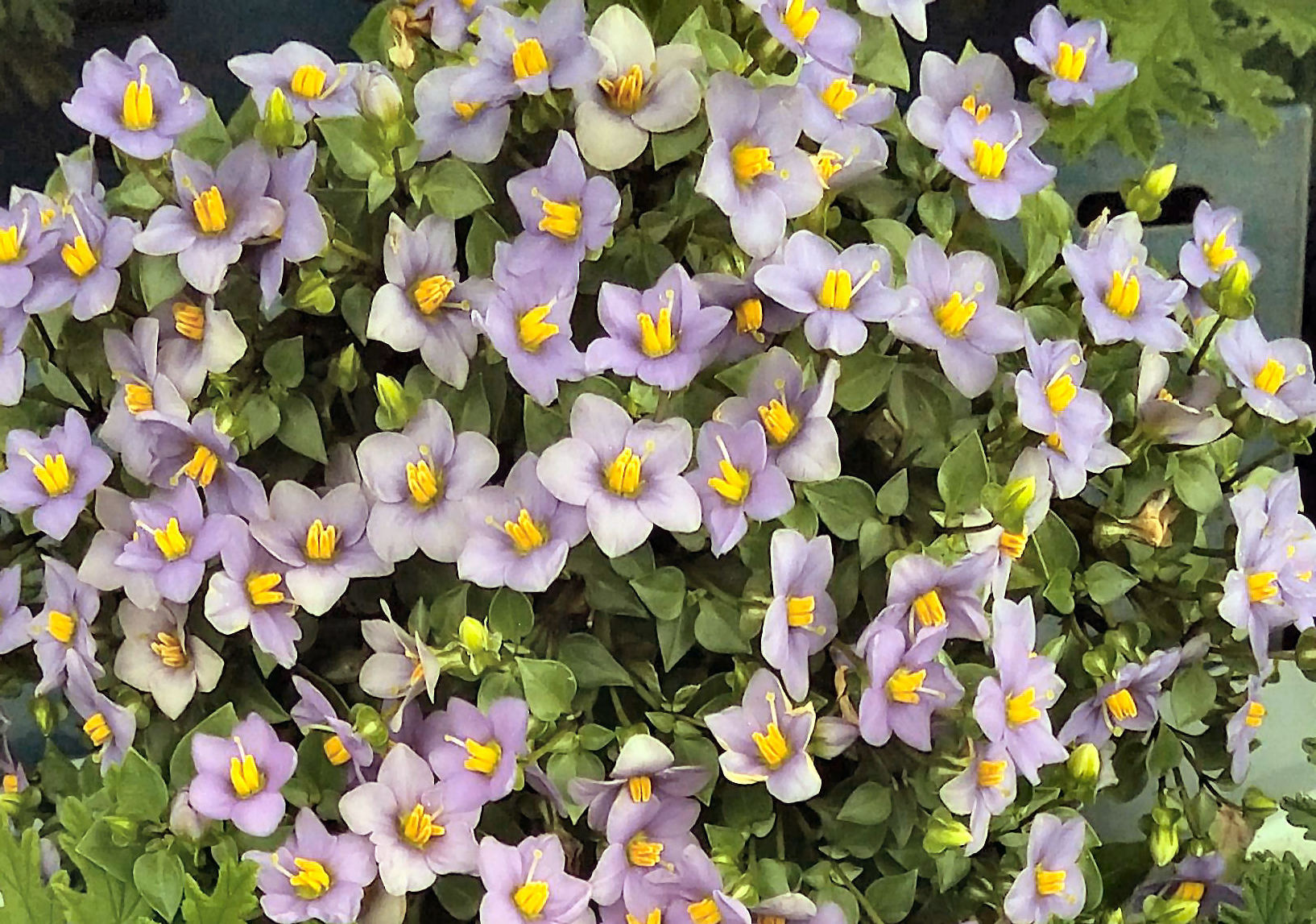 青い宝石をちりばめたように、株一面に花を咲かせます。花は個性的で、青い花弁と中心部の雌ずい・雄ずいの黄色とのコントラストもかわいらしく、さわやかな涼感と南国のような雰囲気をあわせもっています。しかも枝分かれして成長しながら、長い期間咲き続けるようです。