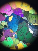 この岩石は“かんらん岩“で、Amazonで取り寄せた24種の岩石薄片プレパラートのうち、一番見栄えのする色の変化を見せました。