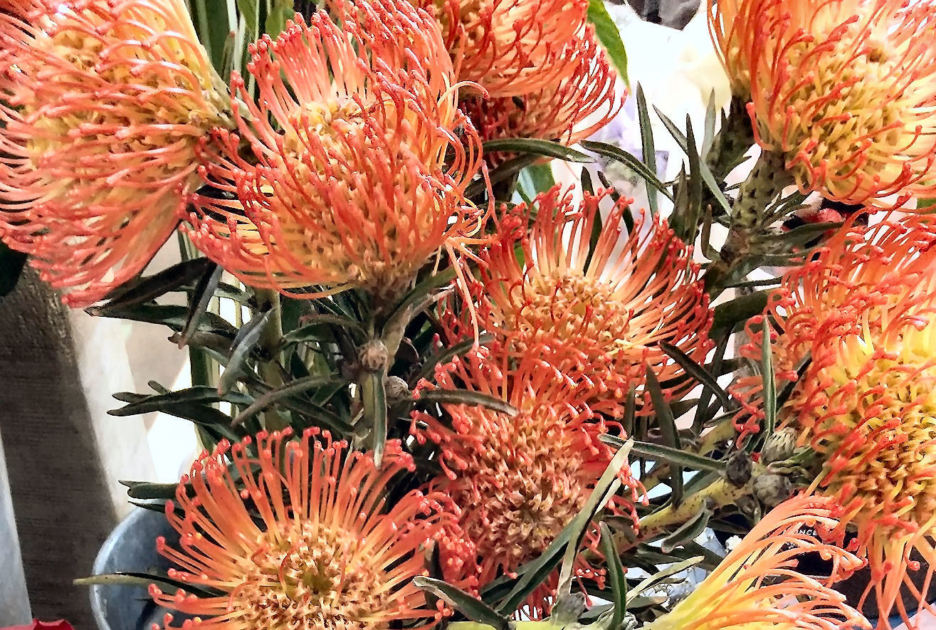 ピンクッション(Pin cushion)=針刺し、と名付けられています。針刺しに針をたくさん刺しているような、特徴ある姿に由来しています。針のように見える1本1本が花で、多数の花が集まり、咲く花はとても華やかです。花持ちが良くて、2週間ほど咲き続けるそうです。
